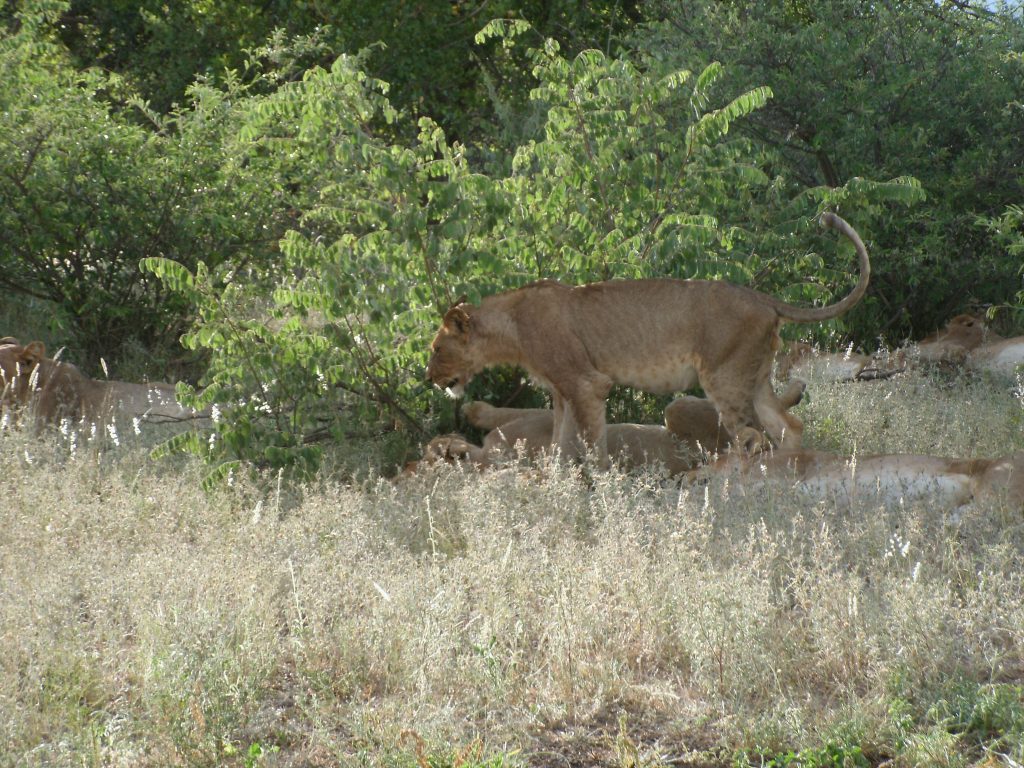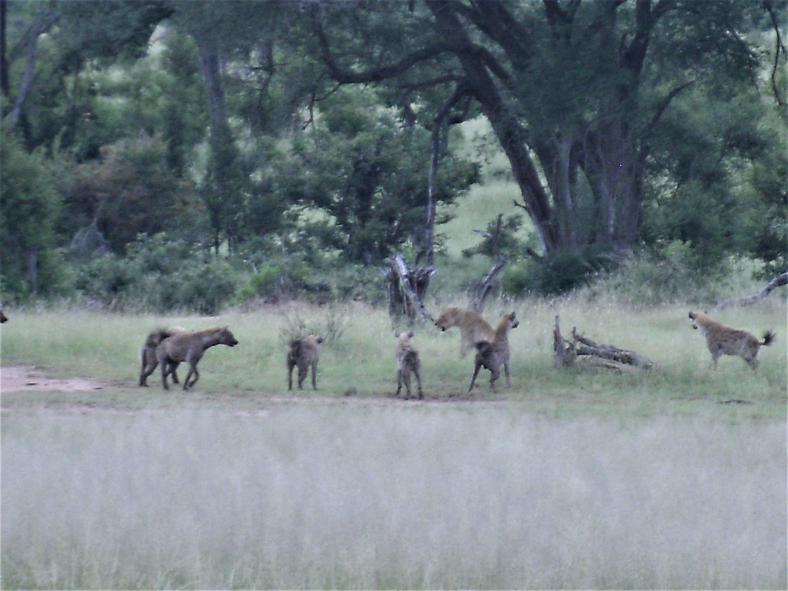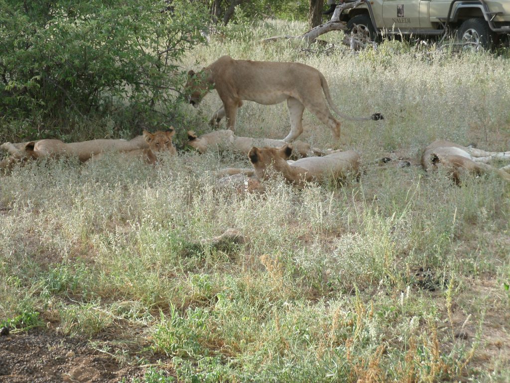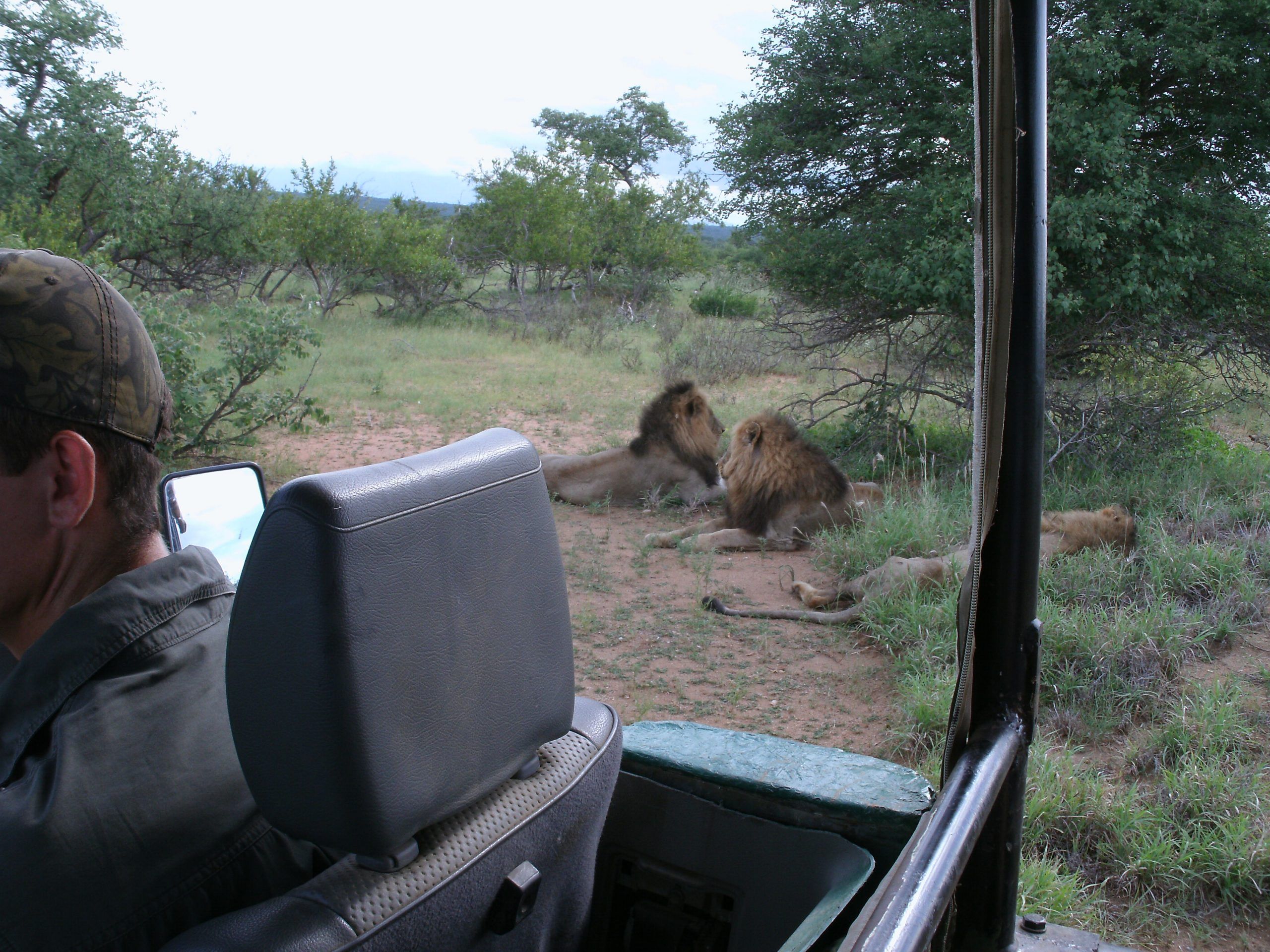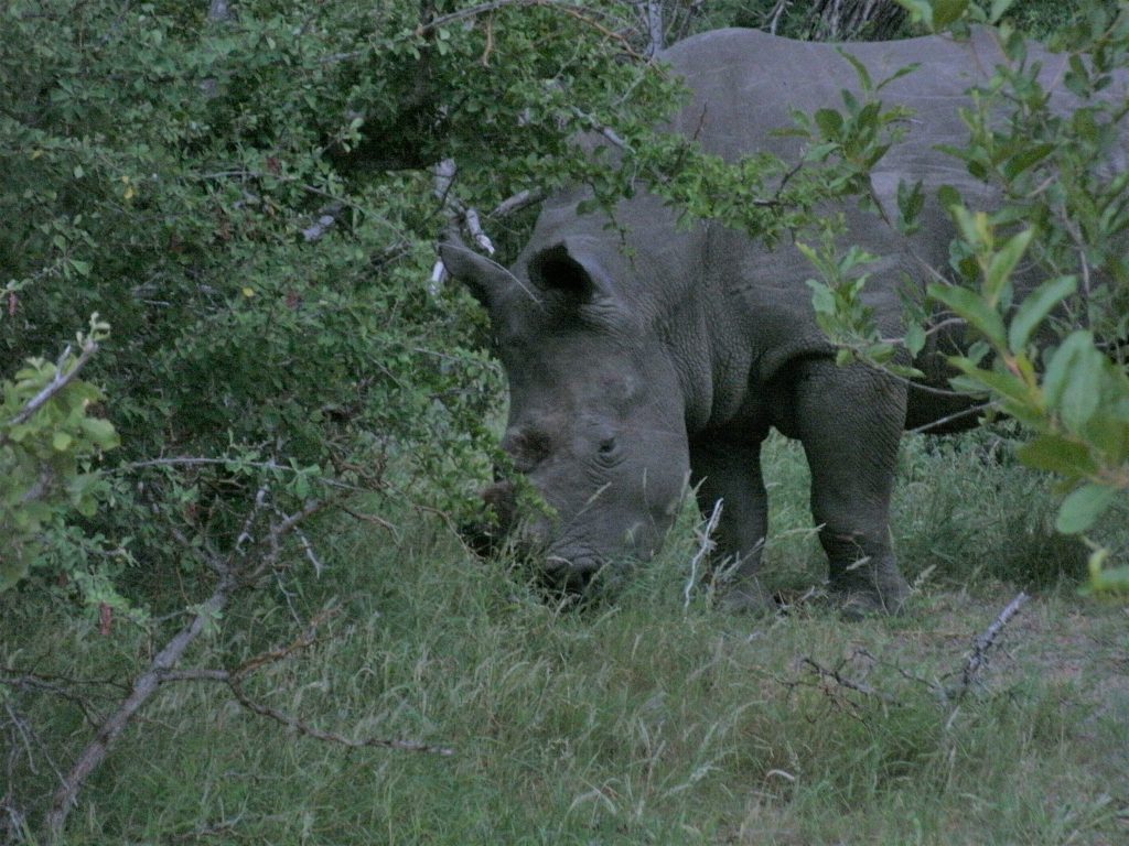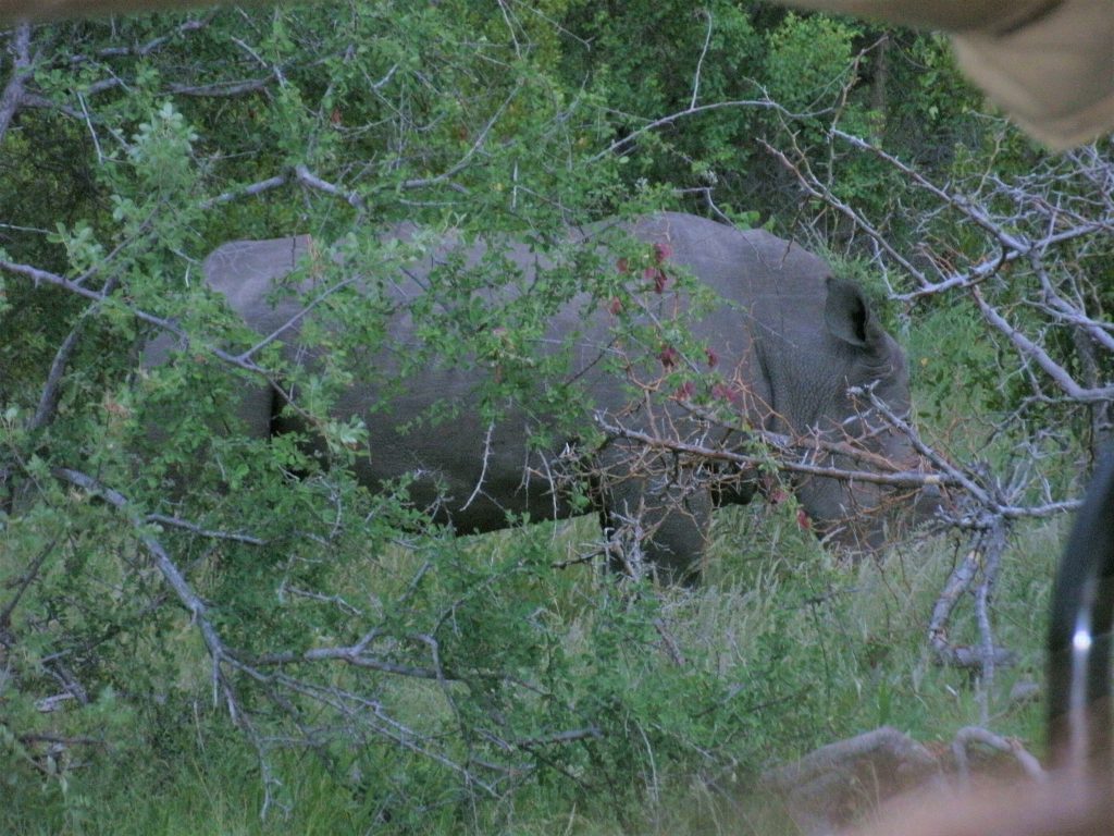 Sat by a pride of around 10-15 lions for a bit. It was very peaceful. They were all panting heavily in the heat. Bernard, our driver, then heard about some fresh rhino droppings. So we headed to that area and he spotted the rhino deep into the bush. It was amazing that he could see the animal. He drove in and we spent some time right near it as it grazed. It was a male black rhino. Had a BBQ outdoors and there was a hyena just past the fire waiting for scraps.