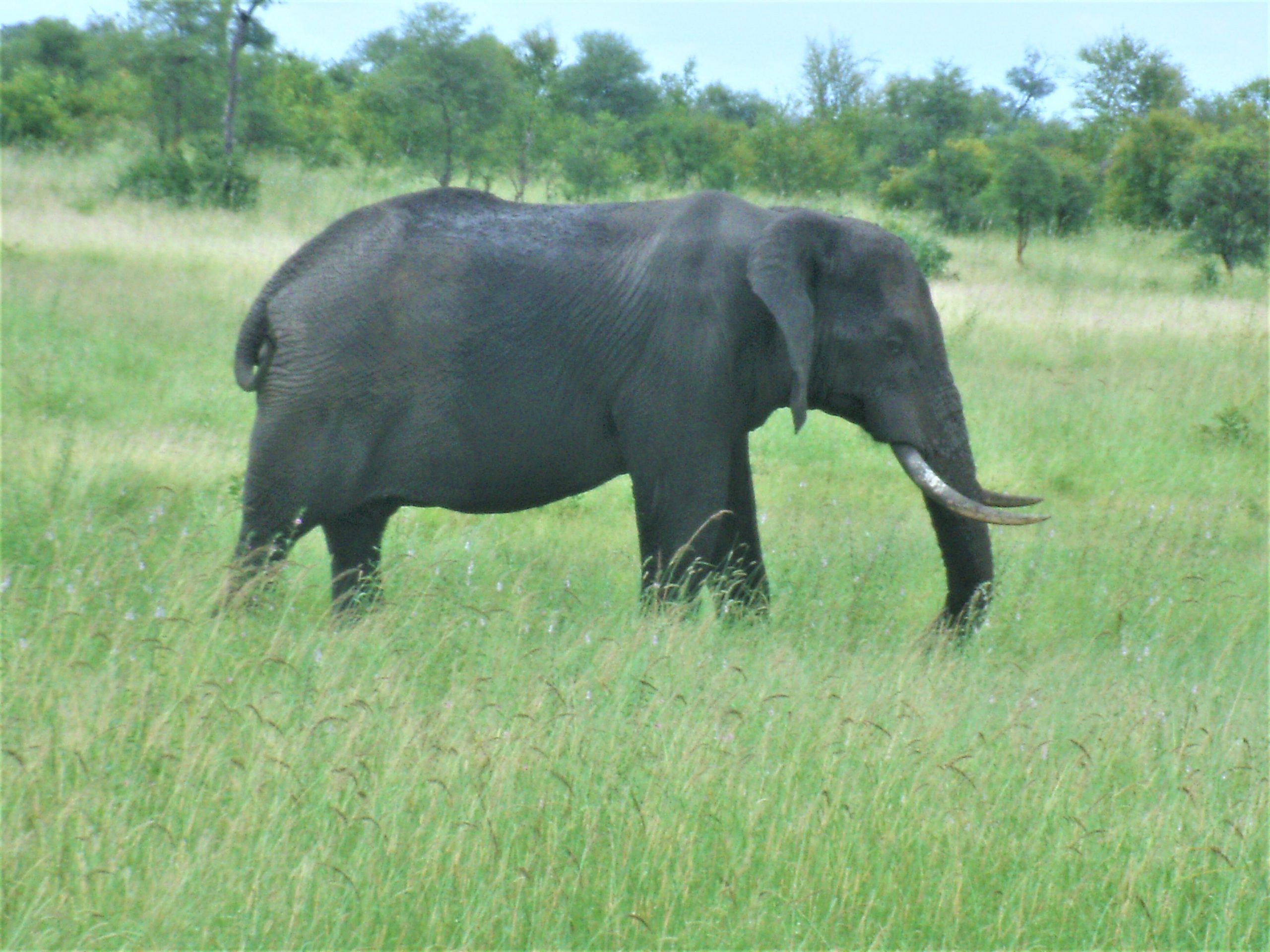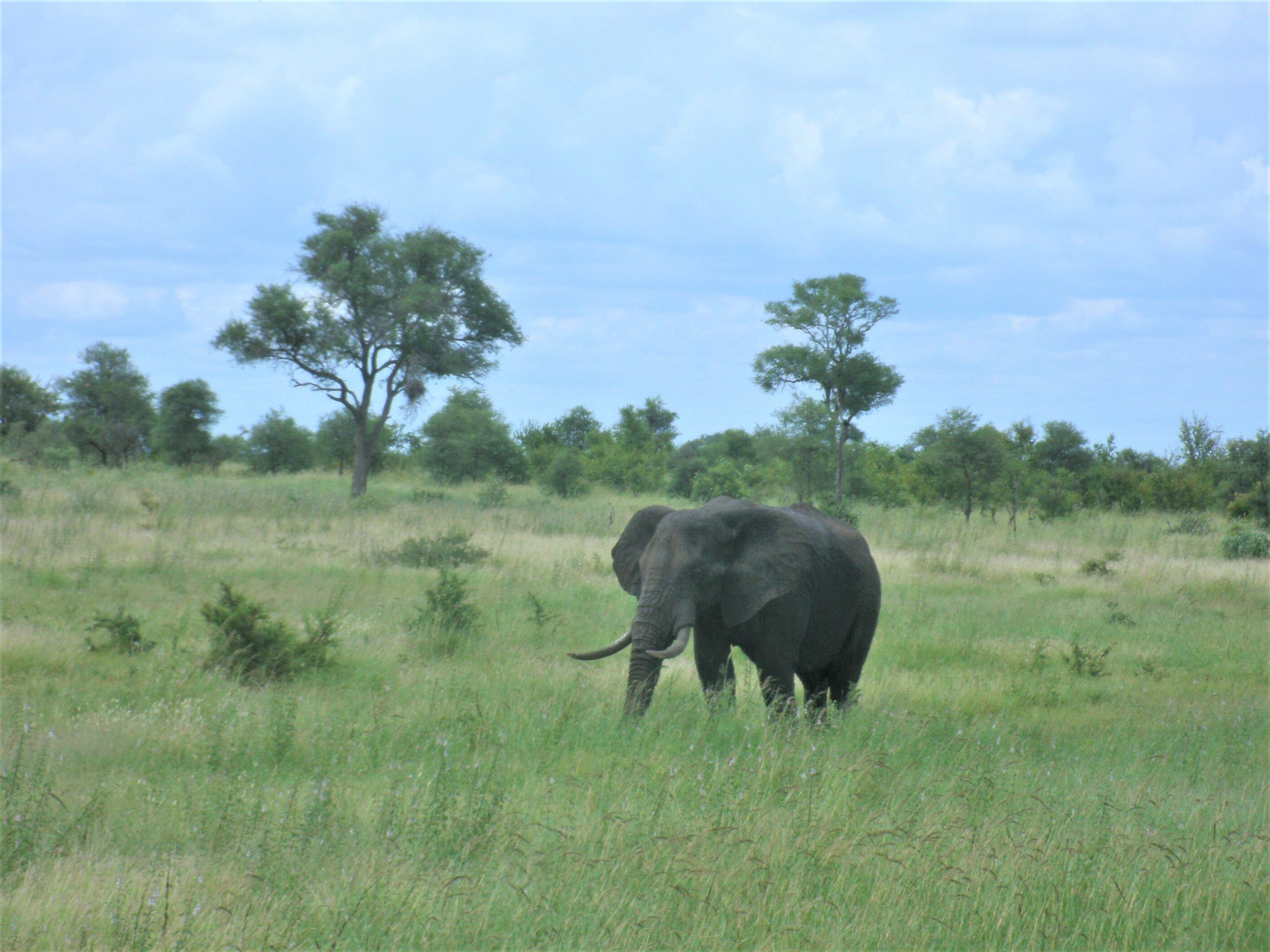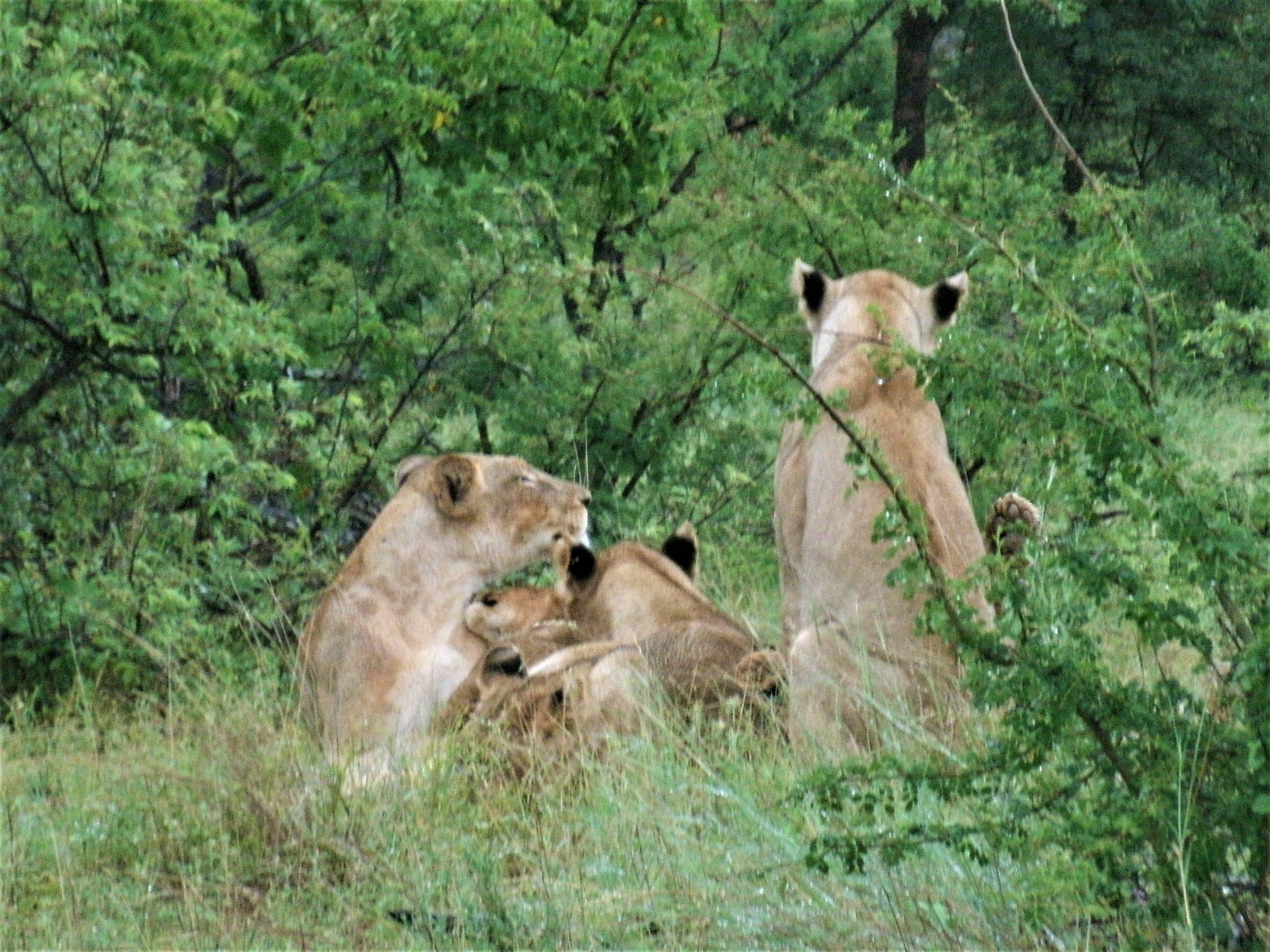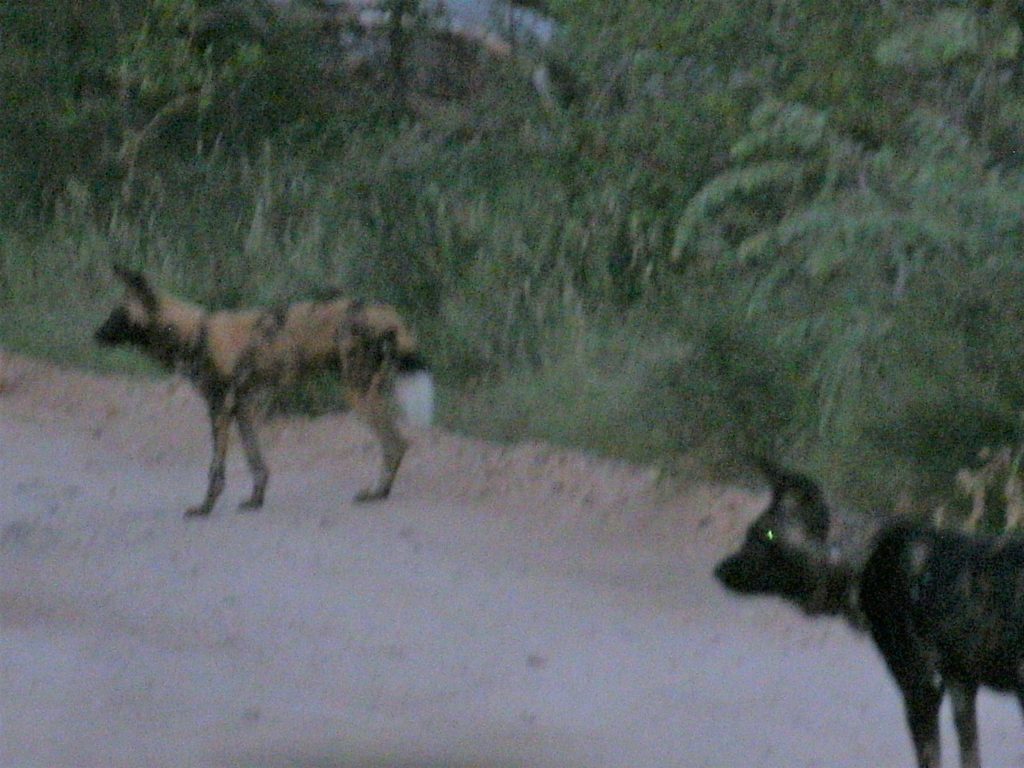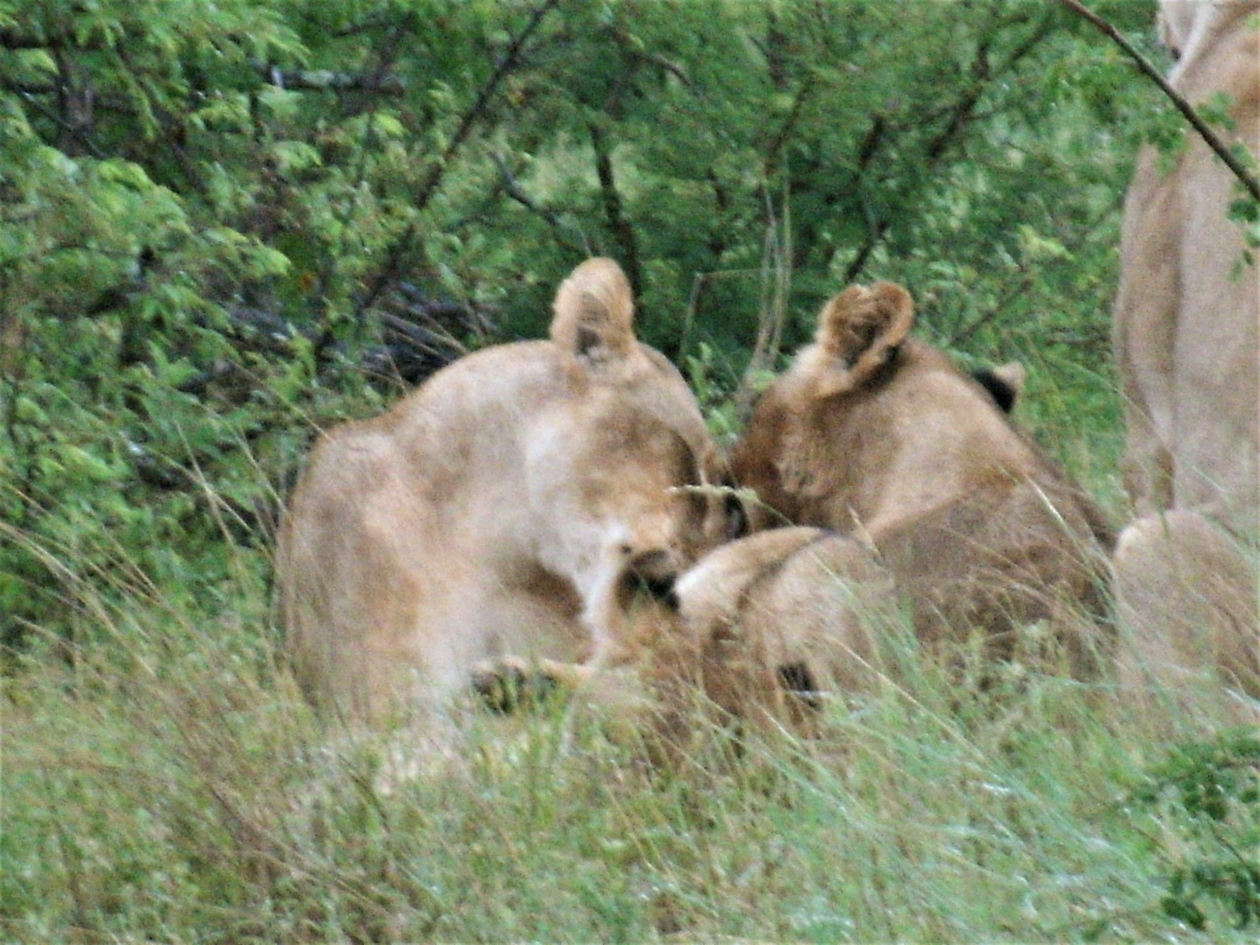 It rained on our way back to the trucks and we all got thoroughly soaked. On the 4-hour afternoon game drive we saw a small pride of 3 large male lions. Bernard spotted the lions by vultures on the trees above. Saw two separate giraffes, 2 elephants eating their way down a hill, and some hippos in the river. We saw a fish eagle and a monitor lizard. We had a nice sundowner snack and drink at the top of a ridge. It was dark when we drove back and we saw the pack of dogs again through Bernard’s lights. Seeing the dogs twice in one day was very lucky. He’s only seen dogs about 10 times over the past year.