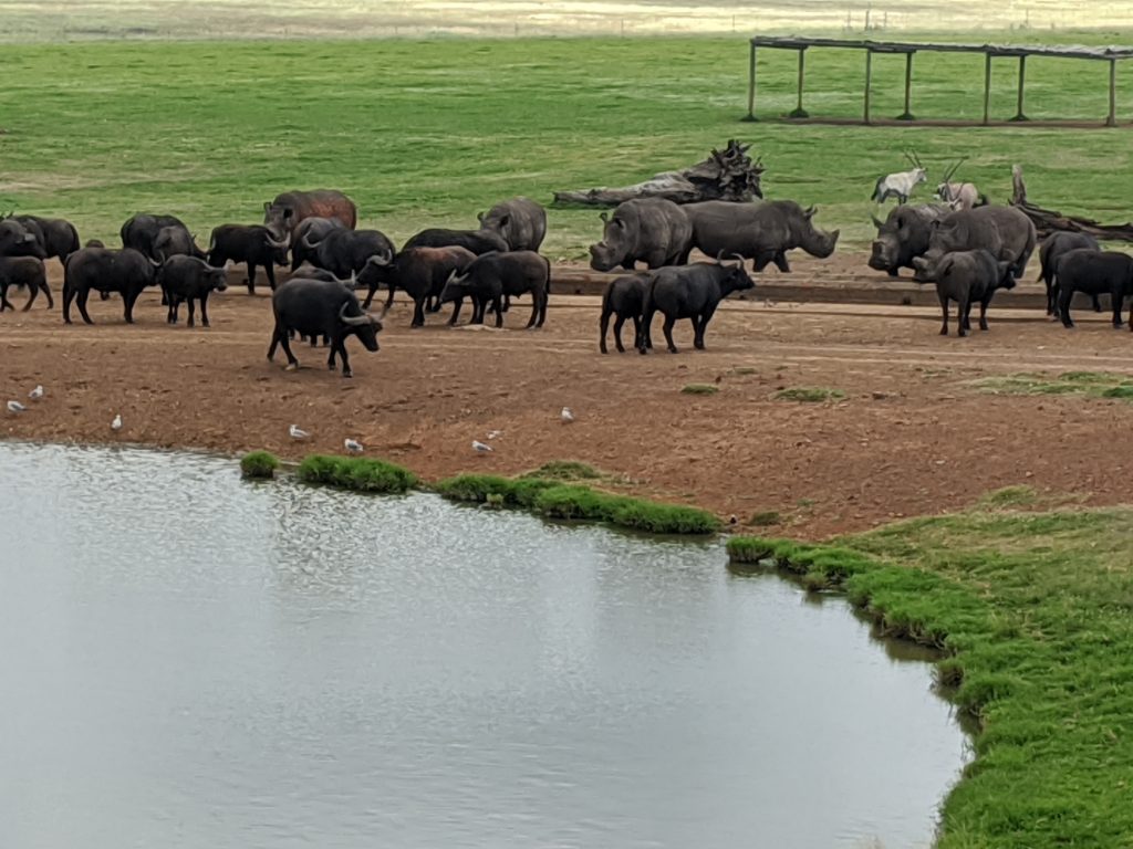 2/7 – The first full day of the South Africa safari I got picked up by the Viva Safari driver at guest house. Then picked up 2 British couples and a Canadian couple from their hotels near the airport. Both British couples were retired and living in Turkey. One was a retired fireman from London and the other a retired ambulance driver from the Midlands area. The Canadian couple owned a large sheep farm in Saskatchewan. Long drive up over 6,000 foot high veld (Joburg at about a mile high) to the lodge. Saw tons of coal trucks and coal piles through part of the drive. Immediately went on a game drive. Saw water buffalo right out of the gate. Lots of impala.