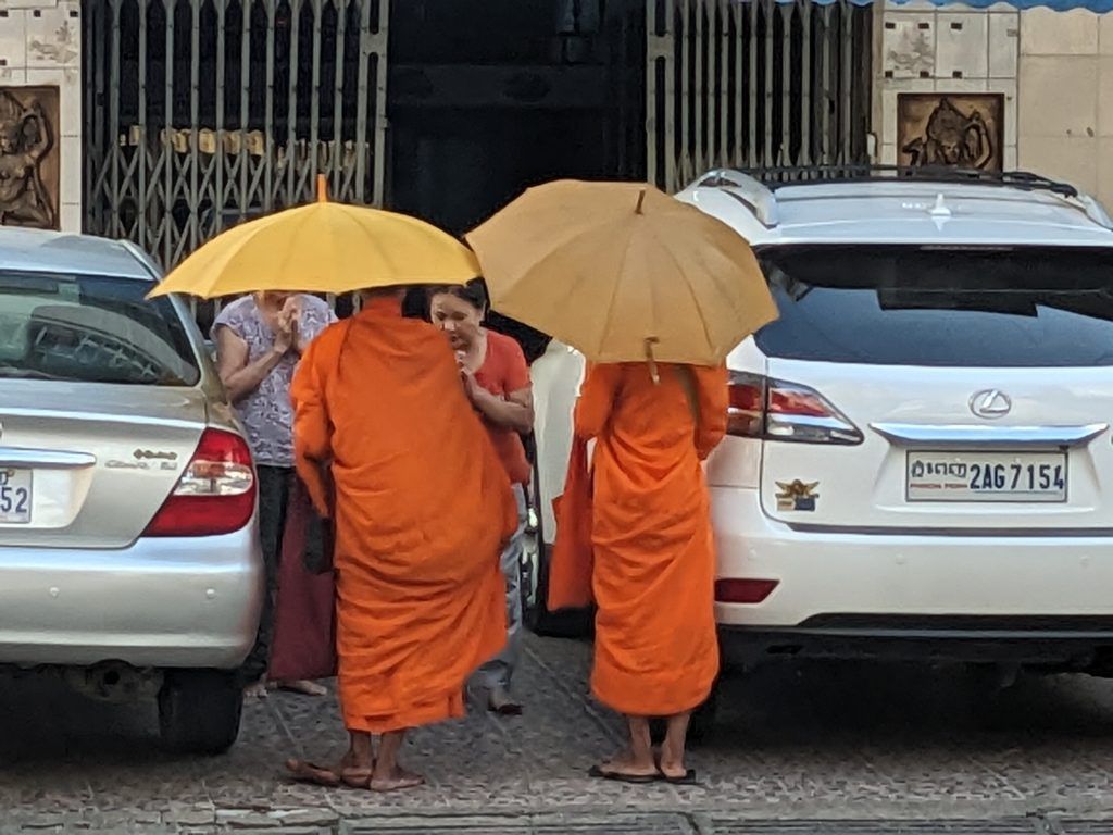 A couple of monks getting their rice bowls filled and then providing some nice prayers and chanting to their neighbors.