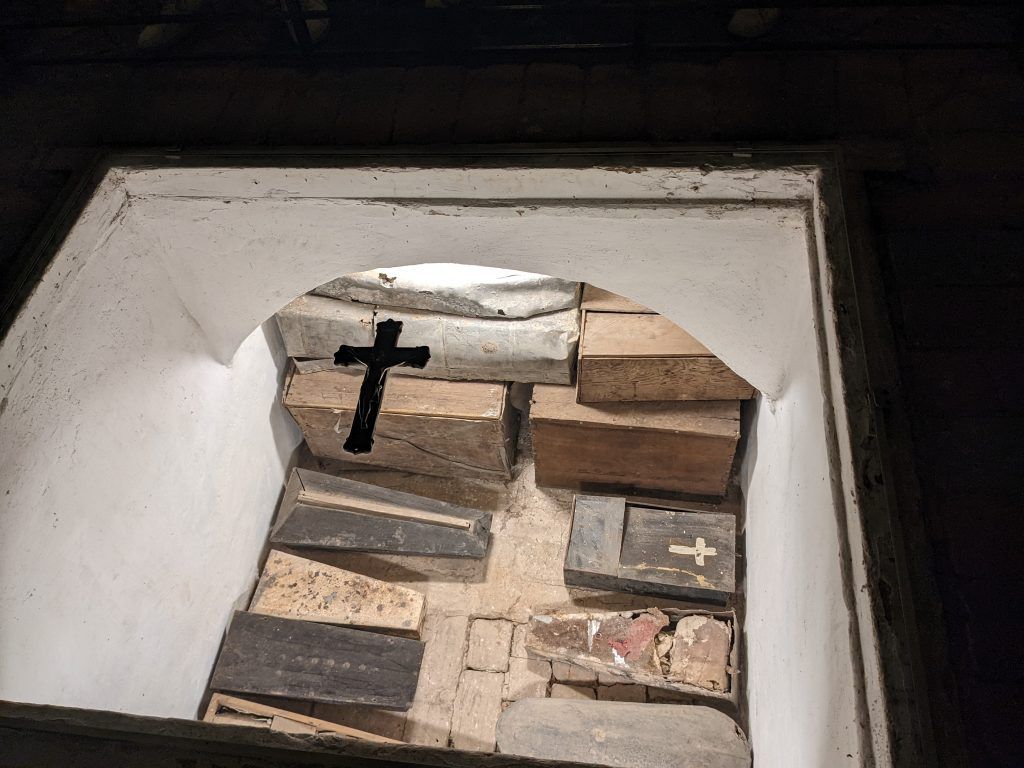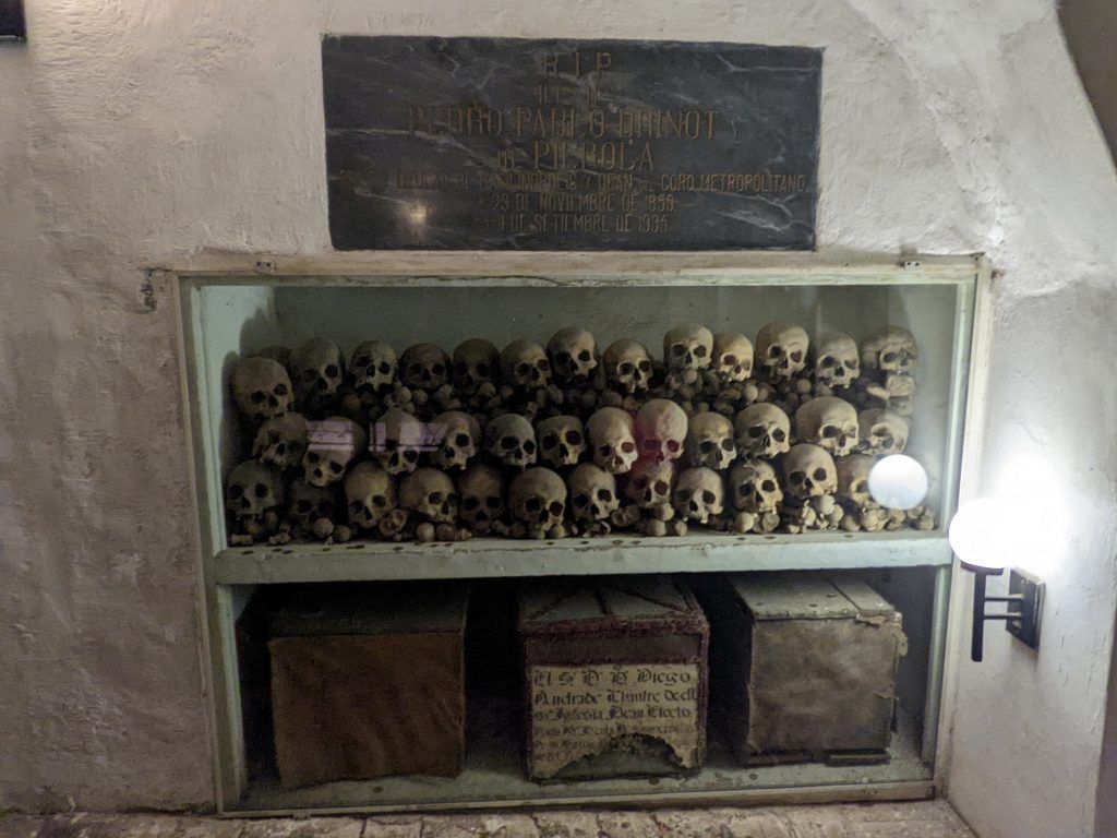 Finally, the most macabre part of the tour is what our guide said was mass burials of the part of the thousands of victims from huge earthquake and tsunami that hit Lima in 1746. Below are some of the coffins, including the smaller ones of children.