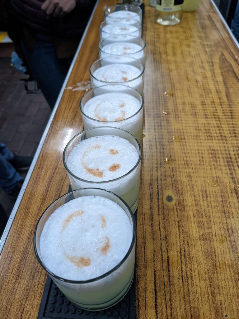 We headed over to Juanitos to sample what many consider to be the best pisco sour in Lima. Juanitos was founded in 1937 by the grandfather, Juanito, then taken over by the father, Juan, and is now run by the son, also Juan. Pisco is a very strong Peruvian brandy made from grapes. The sour comes from mixing 3 parts pisco, 1 part lime juice, 1 part syrup and a dash of Angostura bitters (which forms the smiles below). It’s very strong and very good.