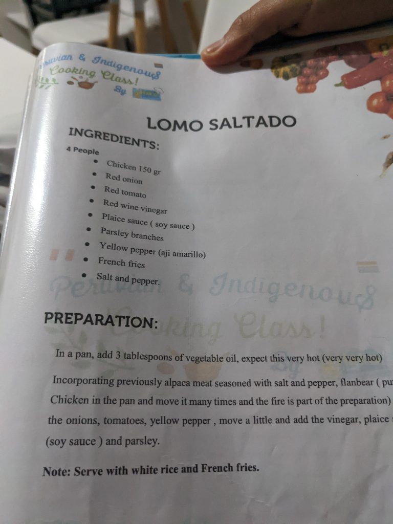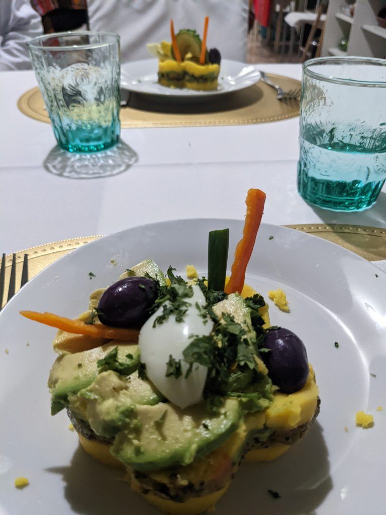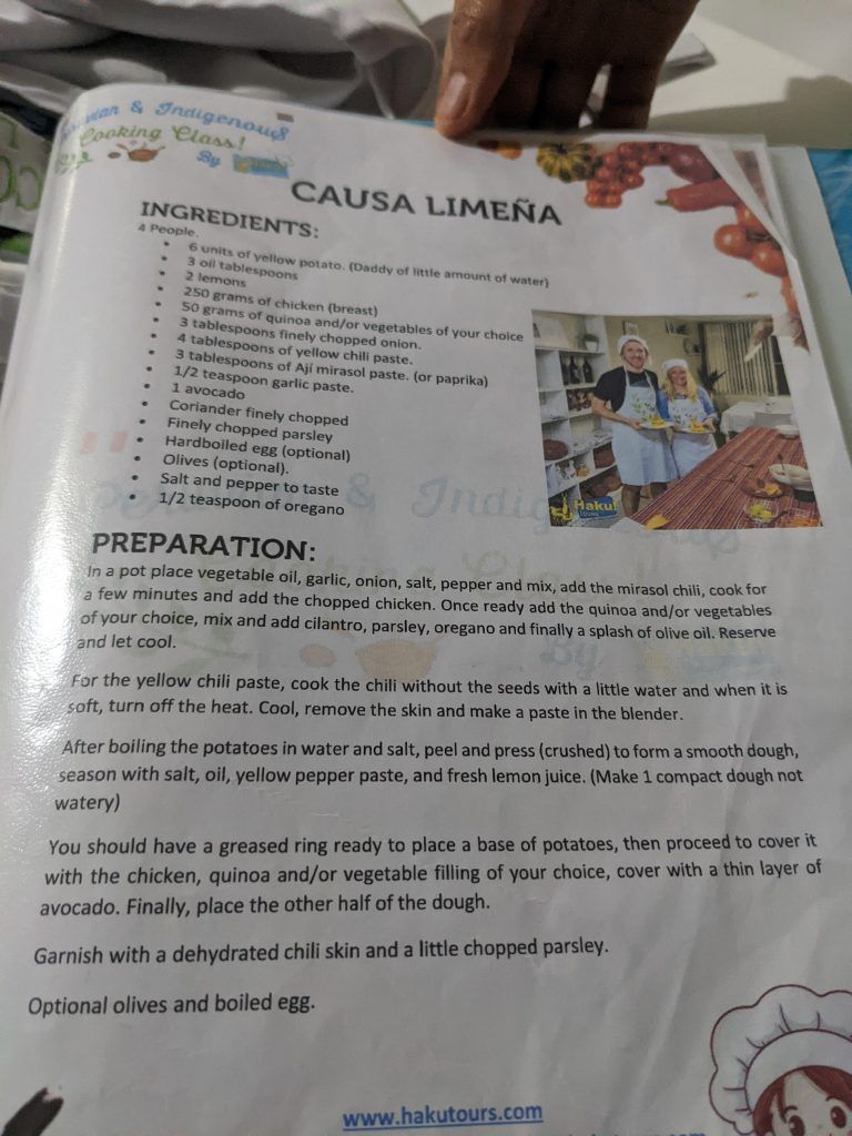 I had a chance to take a Peruvian cooking class. It was a slow Monday night and I had the whole experience to myself. We first made a wonderful appetizer the the chief created called Causa Limena with a slew of vegetables sandwiched between two sections of yellow potatos. They had me take a picture of the recipe as well.