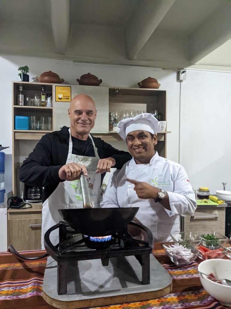 We then got to reenact my chifa dinner from the food tour and actually make the same dish I had that night: Lomo Saltado. Within a couple of minutes of taking this picture we added the beef, seasoning, red wine vinegar and soy sauce to this skillet and then flames shot up about a foot high. It was pretty fun and part of the quick cooking process, but unfortunately it happened too fast to get a picture of it.