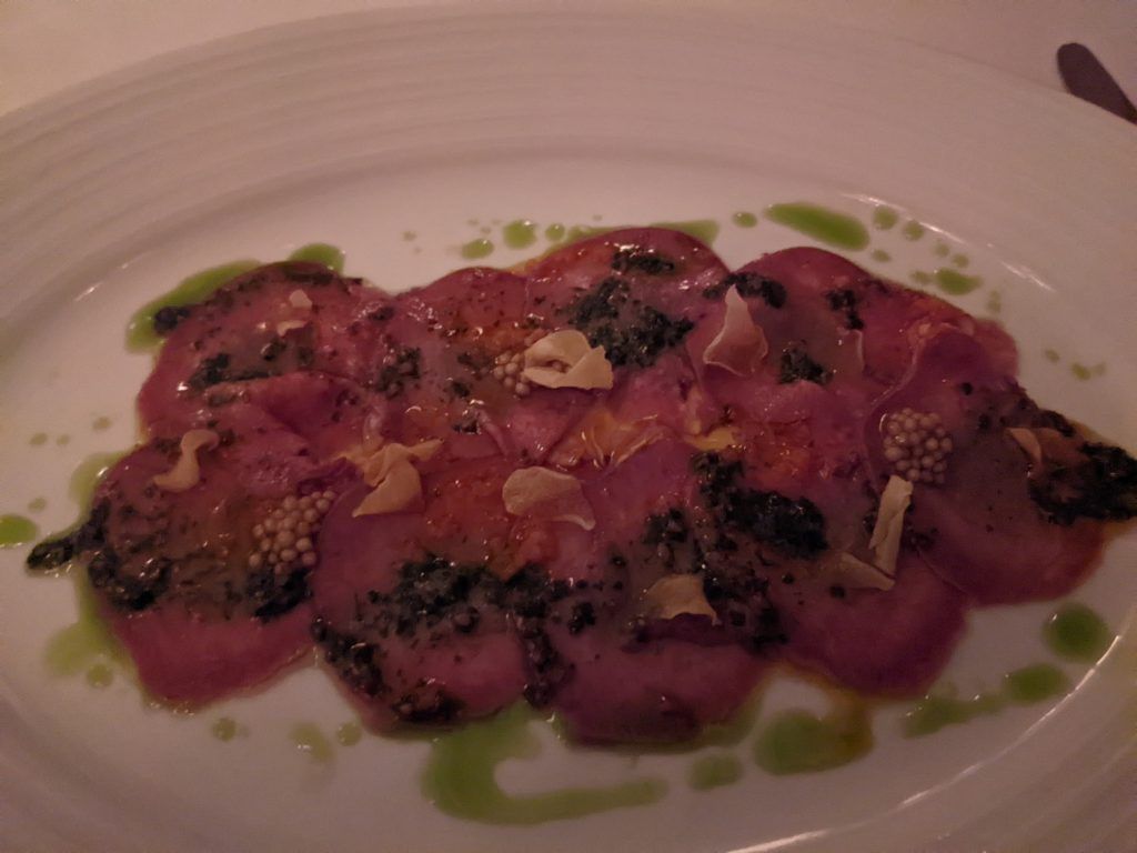 The second was Rafeal. It’s known for mixing up Peruvian, Italian and Japanese flavors. I looked at their listed menu of the day and went with three dense protein rich dishes. The first was beef tongue carpaccio.
