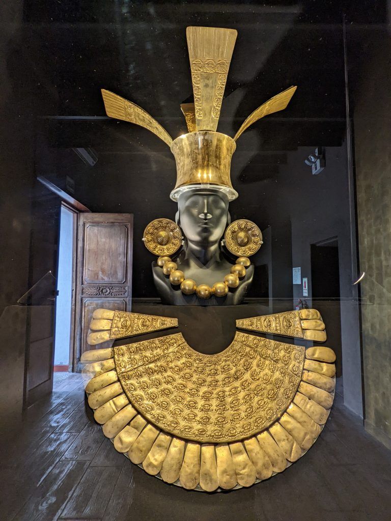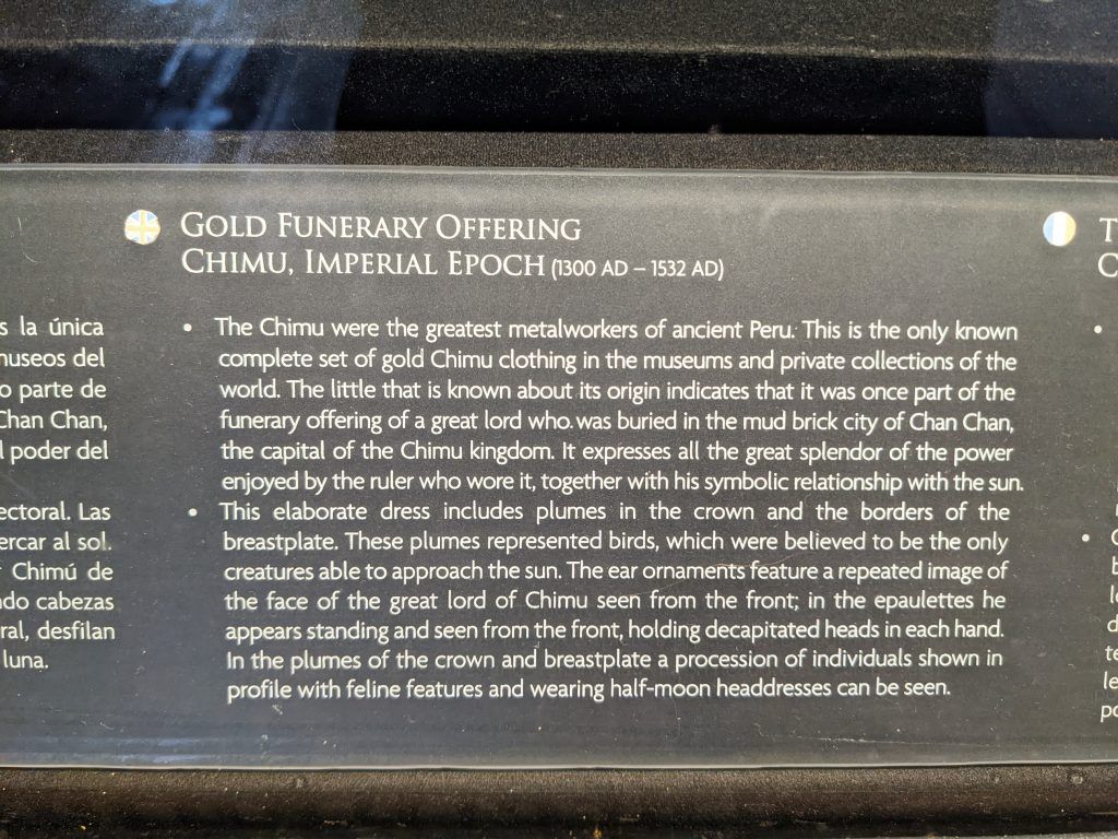One of the fascinating things about seeing the different ruins and museum pieces of the ancient civilizations of Mexico, Guatemala and Peru is how little of their famous gold designs are left after the Spanish came through and shipped everything back home. That’s why it was so unique to actually see some of the incredible gold craftmanship displayed in this museum, as documented by the description below.