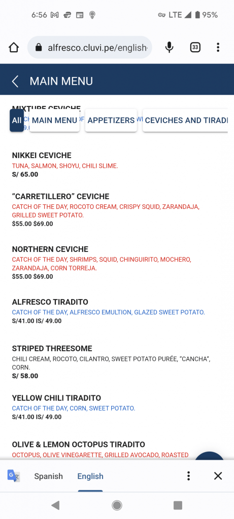 The first was Alfresco. It’s a well known local seafood restaurant. I had the Carretiller Ceviche listed on the phone menu below. It was really good, but I think the basic ceviche I had on the food tour was better. However, the appetizer of six clams in olive oil, butter and avocado was incredible.