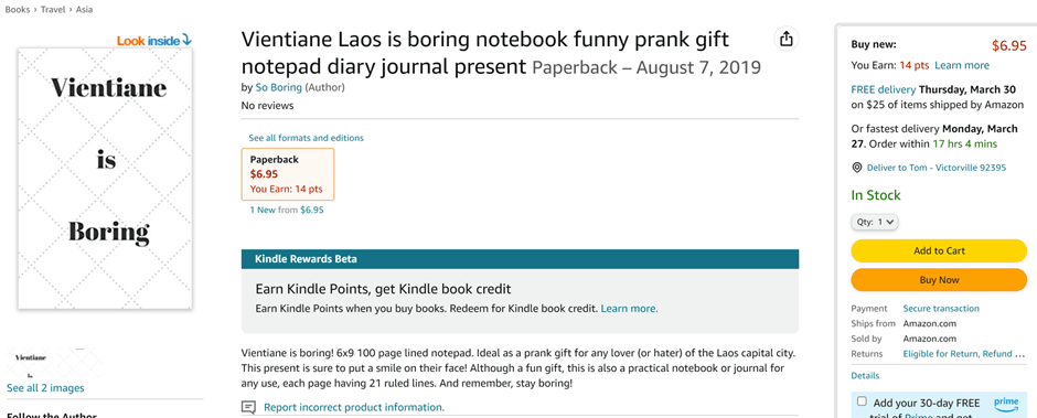 Vientiane is a bit like Laos in general: sleepy, relaxed and sometimes underappreciated. It’s also known as being kind of boring. The Amazon gag gift below definitely plays on that theme.