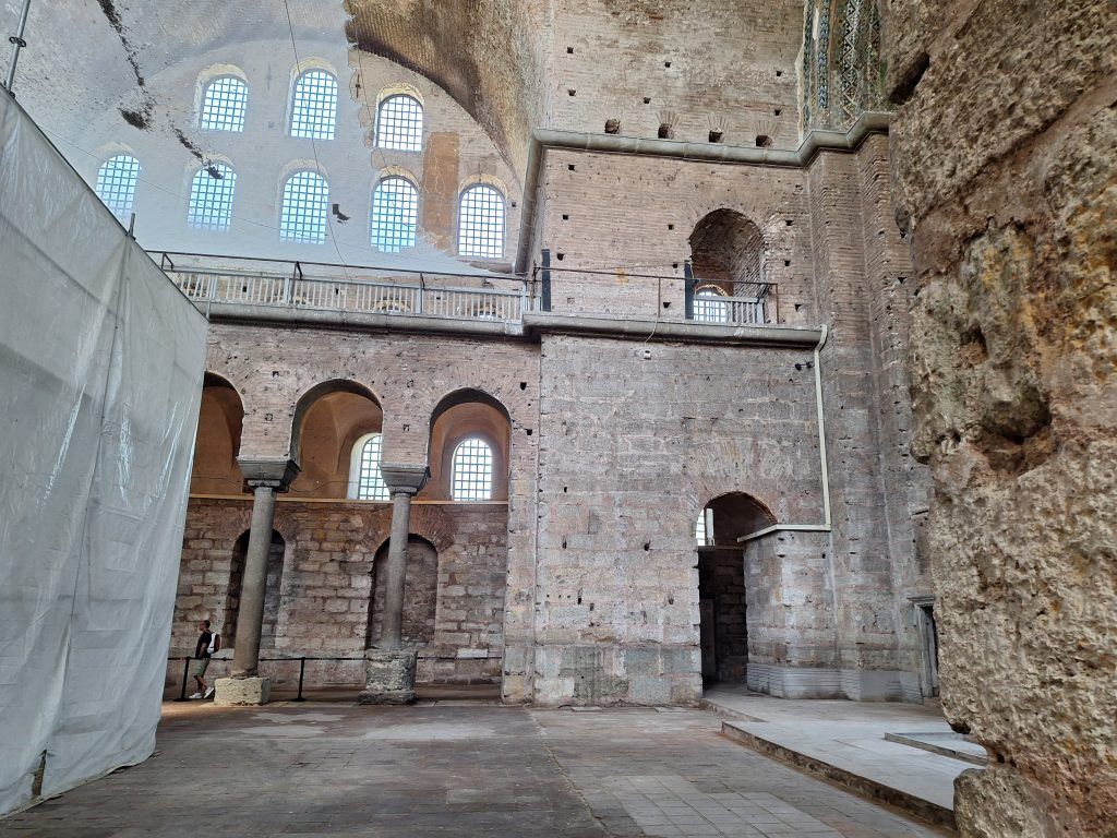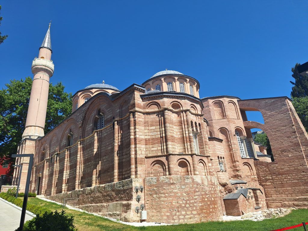 In the early 16th century, 60 years after the Ottomans took Constantinople, the church was converted into a mosque. A mihrab (prayer niche) was built off-center in the main apse (to face Mecca), and the bell tower was replaced with the minaret you see today. The Byzantine-era frescoes and mosaics were whitewashed over and remained hidden from daylight until the late 1940s, when they were rediscovered and restored.