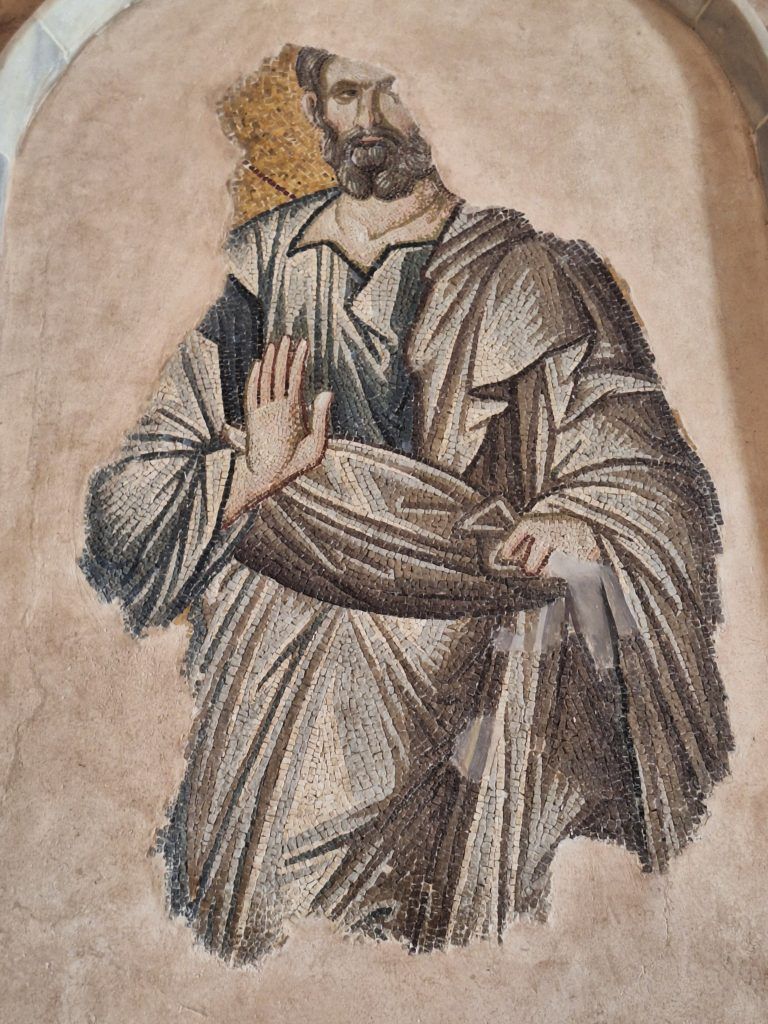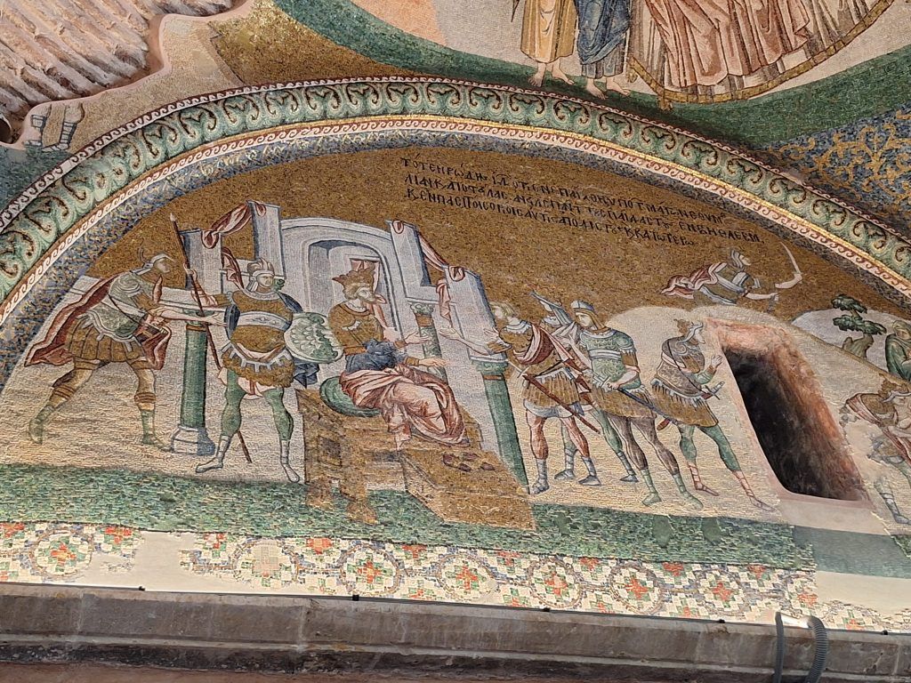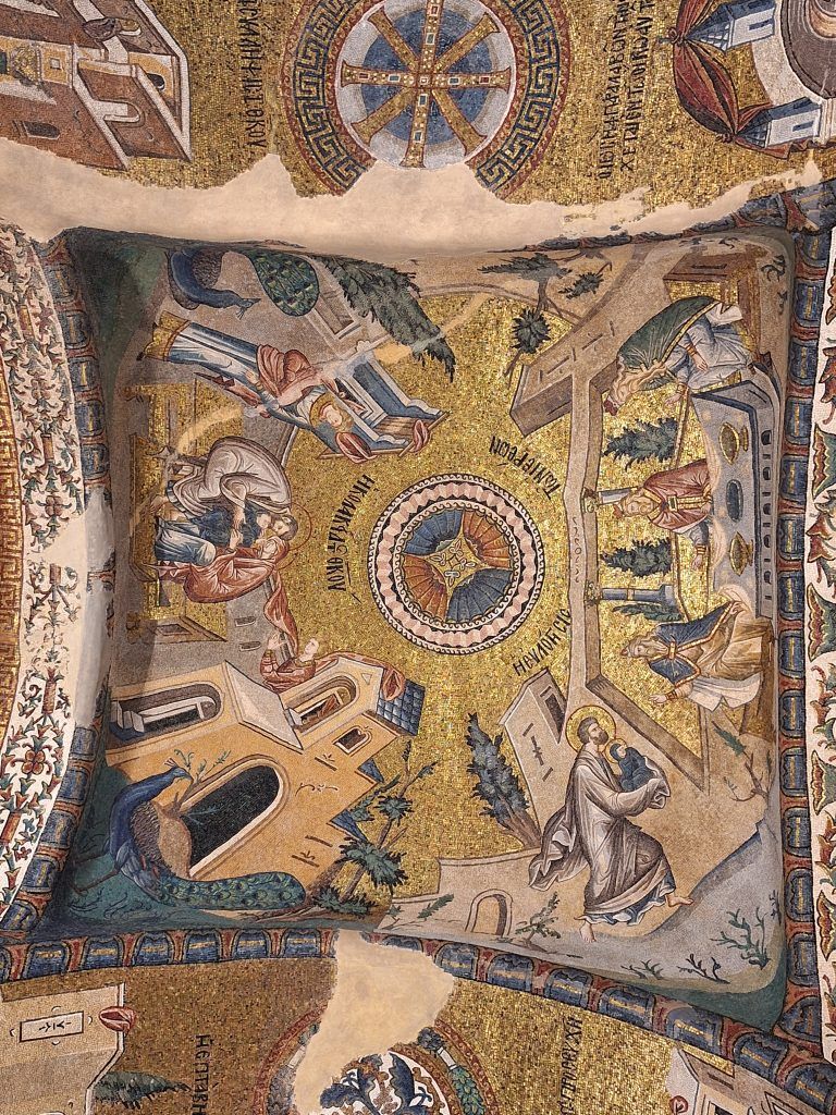 The mosaics are from Justinian’s day. The ceiling is an elaborate pattern of squares, circles, and arches.