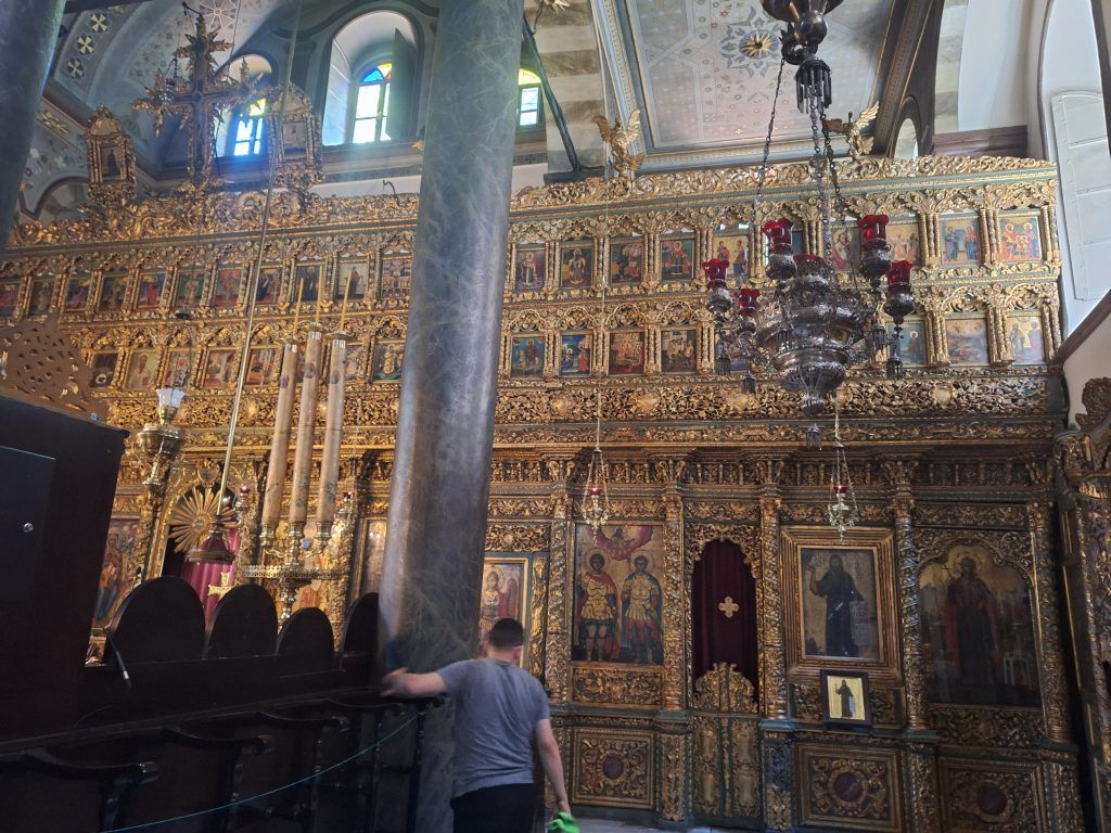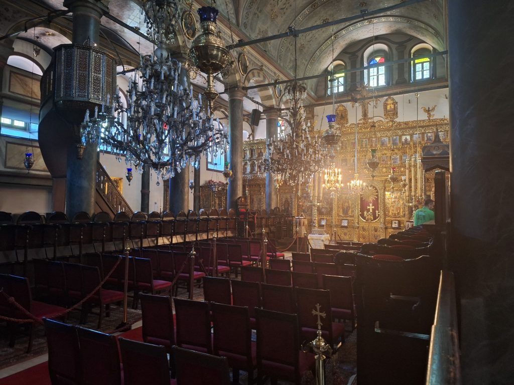 St. George Church is the church within the Patriarchate. It is the Orthodox Church’s much, much more modest version of St. Peter’s Basilica. This church has had a long connection with the Patriarchate of Jerusalem. Every year, on April 23, the patriarch of Jerusalem and the Ecumenical Greek Orthodox patriarch hold a special joint service here, conducted in three languages: Arabic, Greek, and Turkish.
