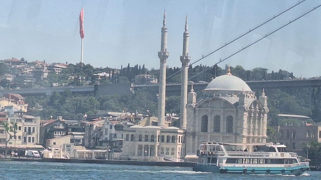 The Bosphorus Bridge is the first bridge we passed. It is the first of three suspension bridges over the Bosphorus. A Turkish-British corporation completed the span in 1973, on the 50th anniversary of the Turkish Republic. Almost two-thirds of a mile long, it carries six lanes of traffic between the continents. The area around it on the European side is called Ortakoy.