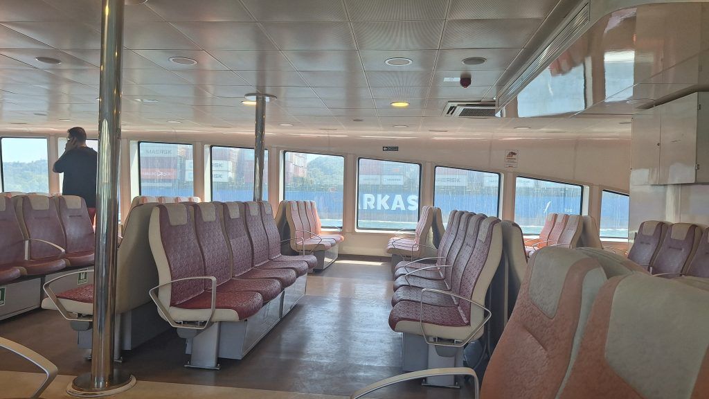 I took the public cruise which took about 2 hours to traverse the Strait. I had a choice of sitting on the crowded top deck, where I could get great pictures but have no sun protection, or down in the much sparcely crowded enclosed deck where I could relax in the cool air conditioning, but take subpar pictures through the dirty windows. I chose the latter option, so please excuse the reflections and dirt on some of these pictures.