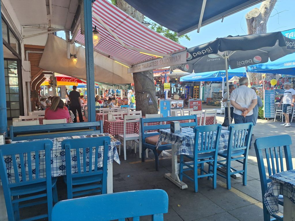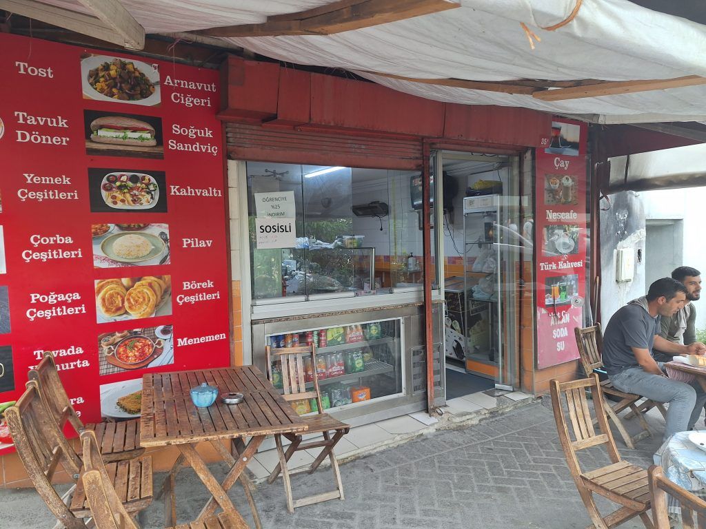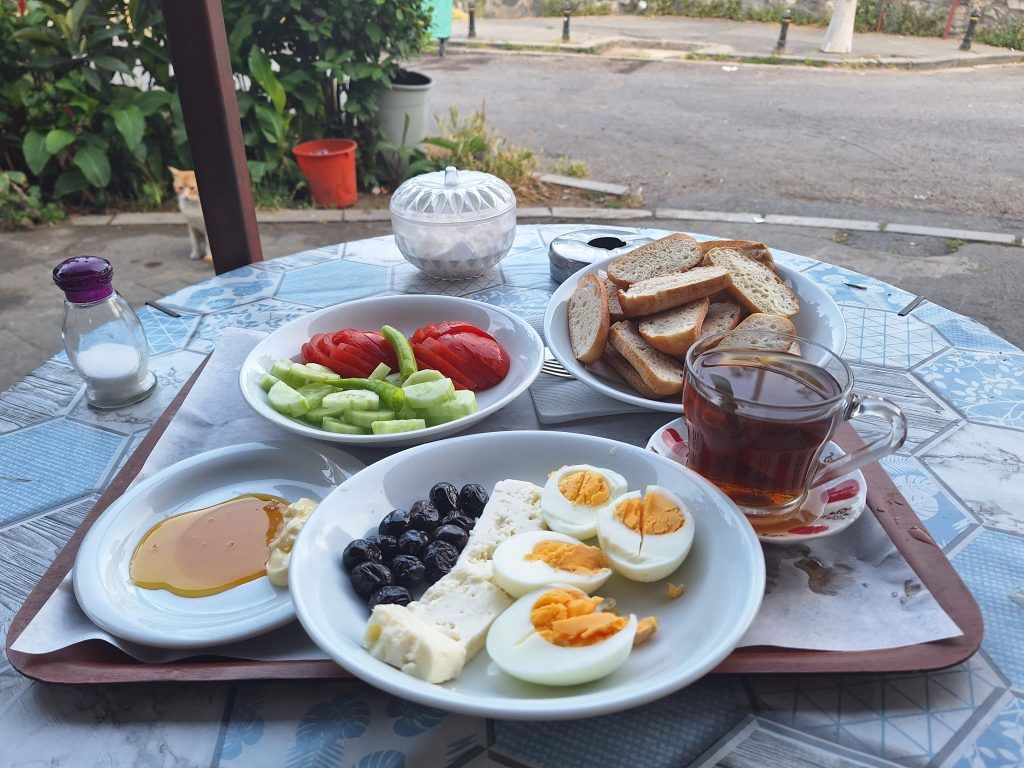 A Turkish breakfast, or kahvalti, is one of the best components of a Turkish diet. It generally consists of black and green olives, cucumbers, cured meats, dips and sauces, eggs, fresh cheeses, fresh tomatoes, fresh-baked bread, fruit preserves and jams, honey, pastries, and sweet butter. I went to a small, local restaurant near my apartment and every morning I got this nicely modified kahvalti. There were no cured meats on the owner’s menu, but I did get him to add some eggs. It was a nice start to each day.
