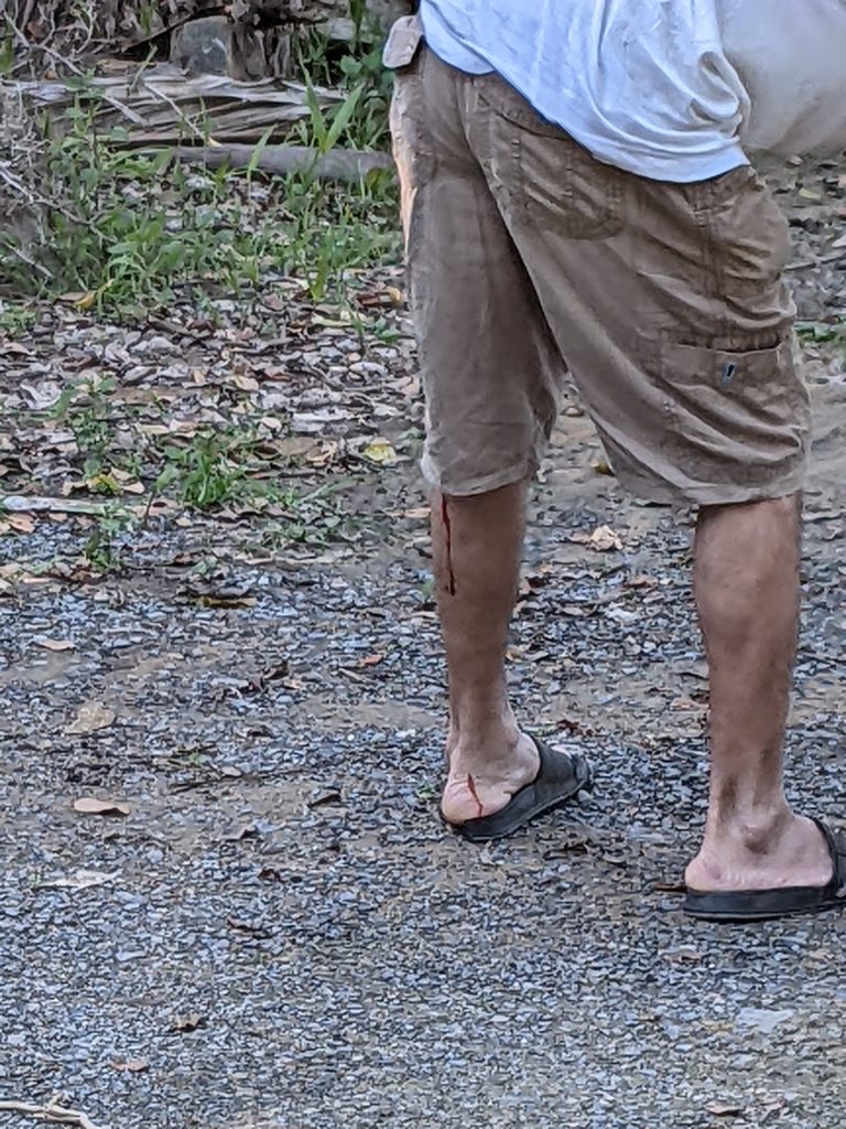A couple of days later I saw it attack a local man who was just picking up coconuts on the side of the road near the house the dog was at. The picture below is the aftermath. He got bit much worse than me. The dog broke my skin, but there was no bleeding.