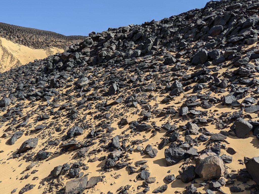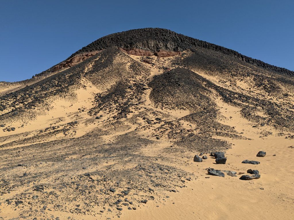 The Black Desert is one of most unique aspects of the Western Desert of Egypt. Arriving there is like stepping into a different planet. The dunes here were originally regular sand dunes. But millions of years ago they were covered by the remnants of a series of nearby volcanic eruptions.