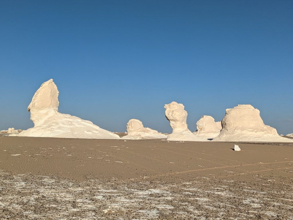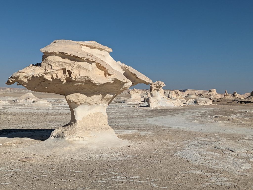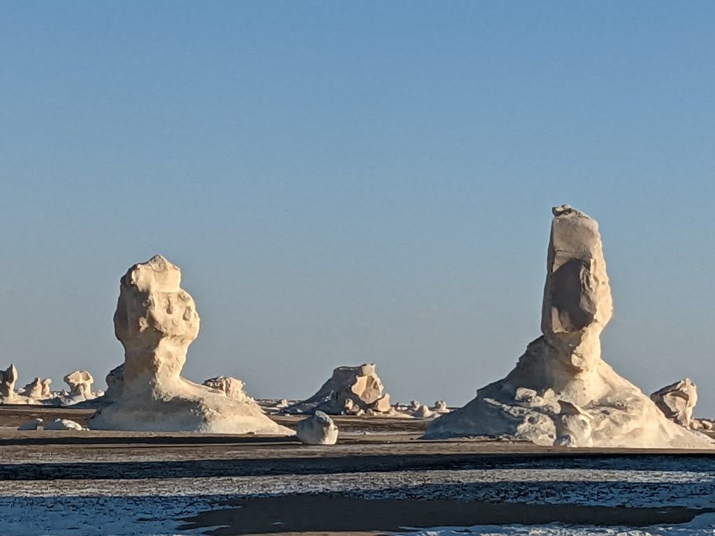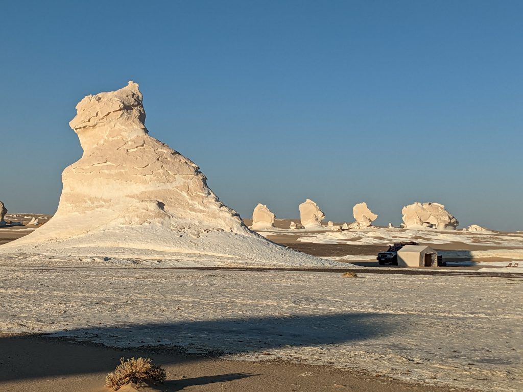 A volcanic rock as found in the Black Desert against some small White Desert formations. A famous elephant looking formationThe famous mushroom and chicken pair. Notice how small our car is next to them. The incredibly unique site of our second camping spot.