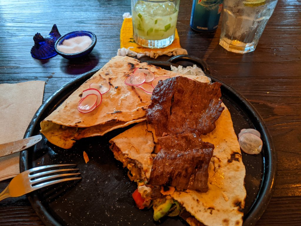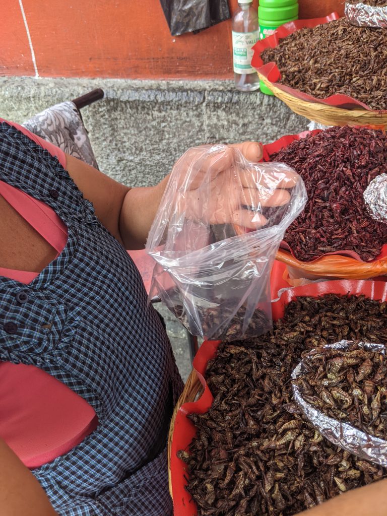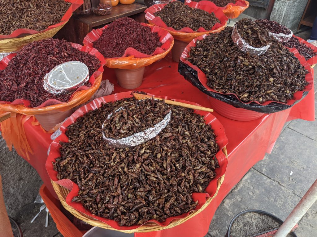 Oaxaca is known for possibly having the second best food in Mexico outside of Mexico City. It’s especially famous for its mole sauces, its tlayudos, its mezcal and its chapulines. Tlayudas are a huge toasted tortilla filles with all kinds of treats and chapulines are deep fried grasshoppers seasoned with chile and lime juice. Yes, you read that correctly, grasshoppers. As you can see, I sampled all four in the few nights I was there.