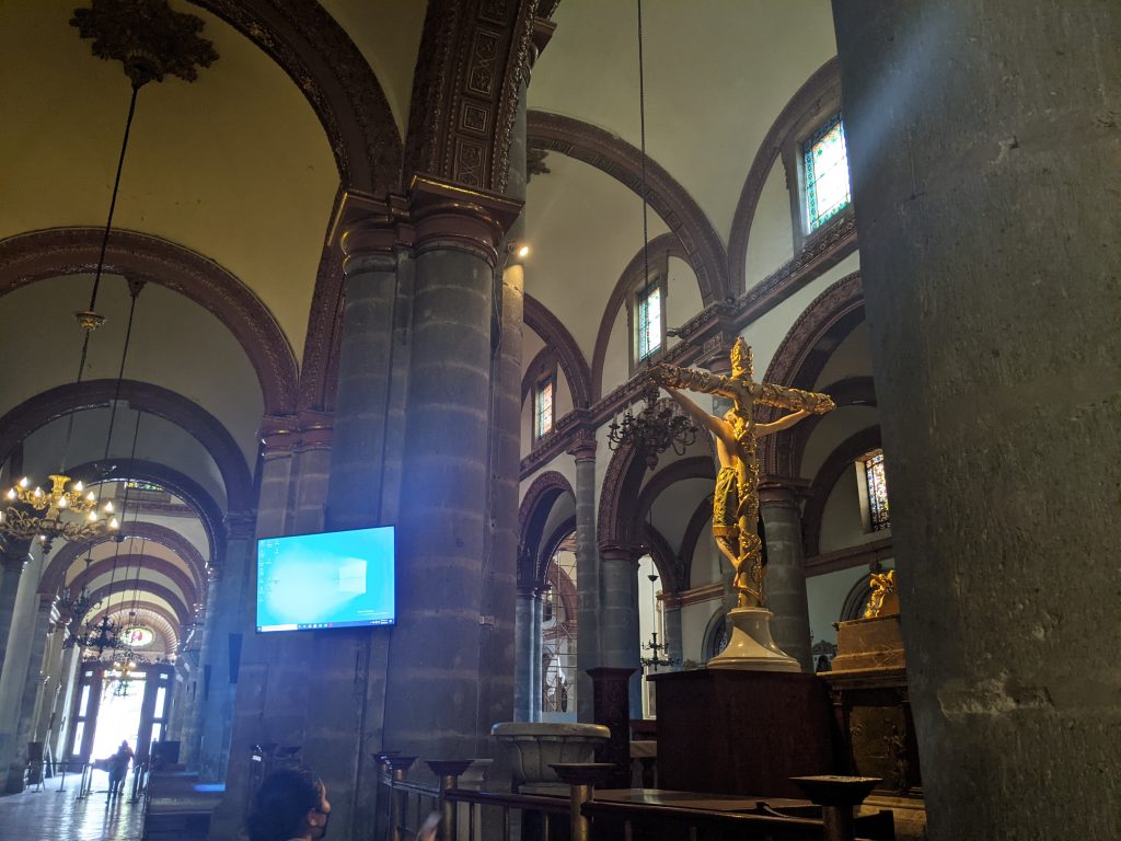 The second church is the Catedral Metropoitana de Oaxaca, where construction started in 1535, but had to be rebuilt a few times because of earthquakes. It’s the seat of the Catholic Church in the region. The exterior is wonderful, but the interior is not that sublime. The interesting part is the large computer monitors around the church so worshippers with bad site lines can still see the service.