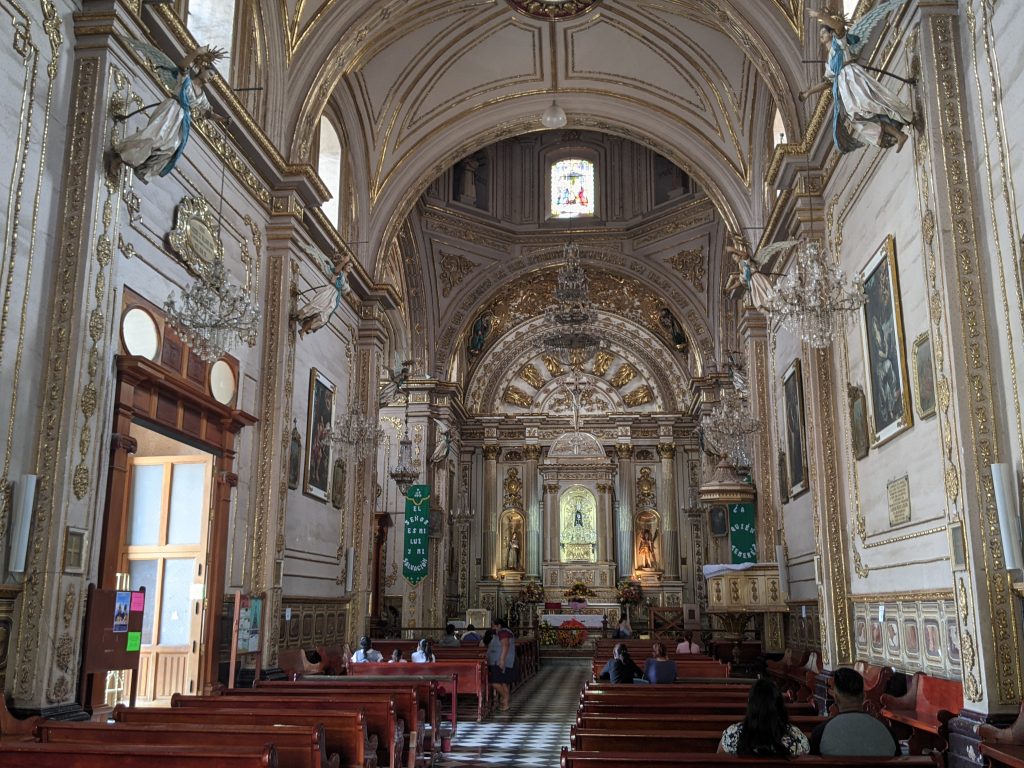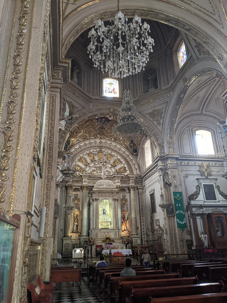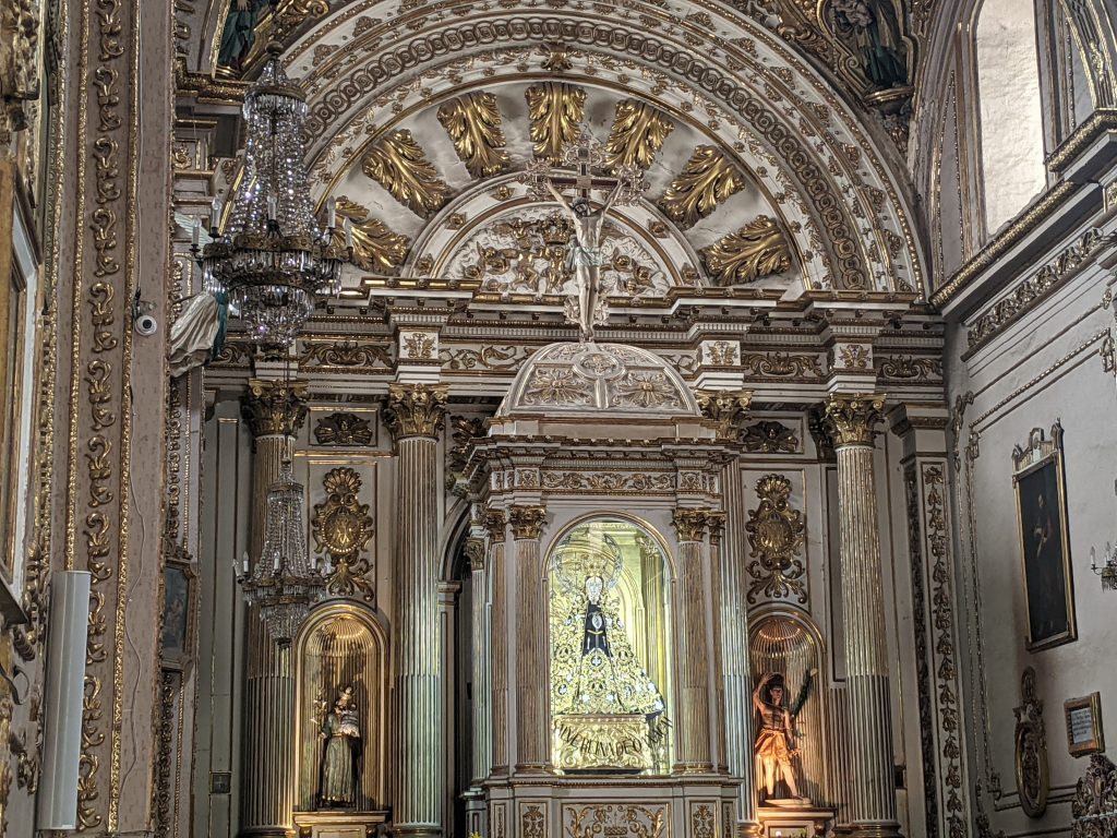 The first church pictured below is the Basilica Memor de Nuestra Senoria de la Soledad. It was built between 1682 and 1690. It’s one of Mexico’s most important religious sites because it’s built on the site where a statue of the Virgin Mary was mysteriously found. Some versions of the story even say that Mary herself miraculously appeared. It’s a beautiful church and a copy of the statue of Mary is in the middle of the alter.